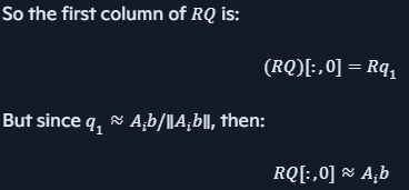 This isn't particularly helpful, but it seems to be the right direction to think of R*Q [:,0] as \(R q_1\) and then to find its connection with A. I should be able to implement QR with the phoebus module, Phoebus willing. Then move towards a clearer understanding of this all important mechanism.