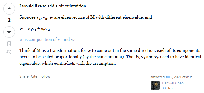 The only other thing is that in the case where \(\lambda_1 = \lambda_2\) any eigenvector within the span of \(v_1\) and \(v_2\) would also have the same eigenvalue. So power iterations can not converge on the same eigenvector as we constructed it, but we will still have identified the same subspace associated with that eigenvalue.